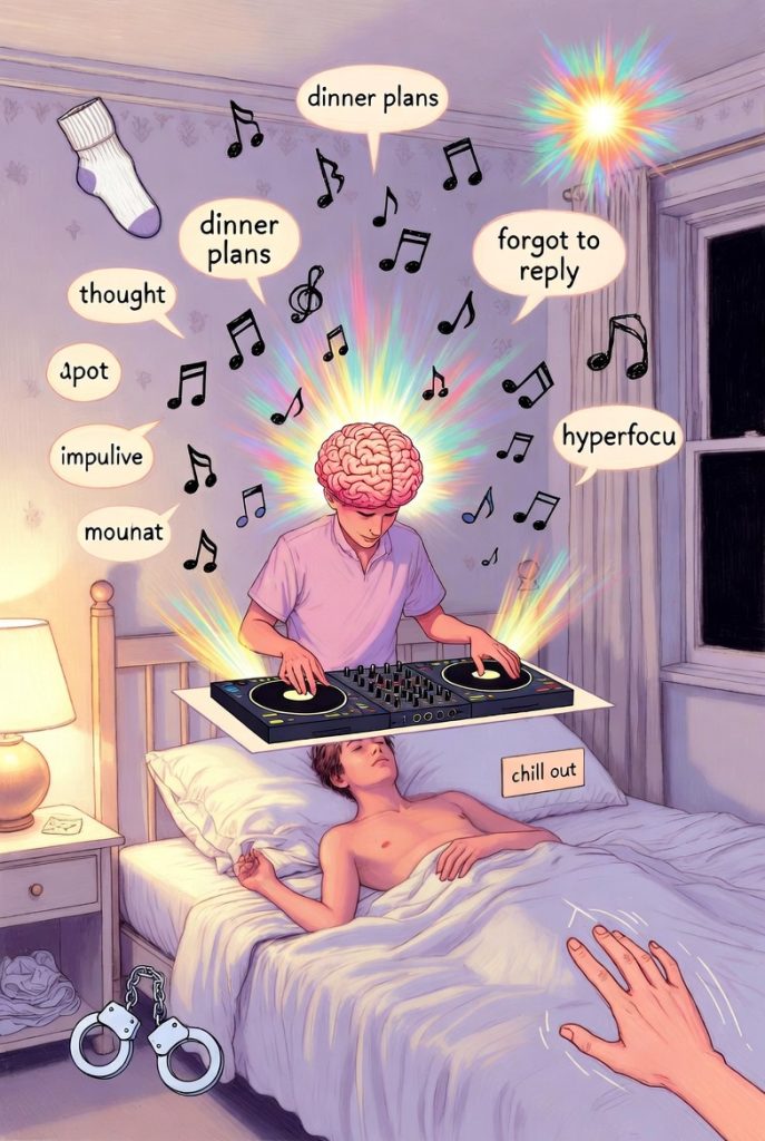 ADHD i senga er som å ha en hjerne som er DJ på en ravefest – noen ganger spiller den banger etter banger med hyperfokus på lidenskap, og andre ganger bytter den spor midt i låta fordi, oops, du tenkte på en tilfeldig ting som hva du skal ha til middag i morra. Impulsivitet?