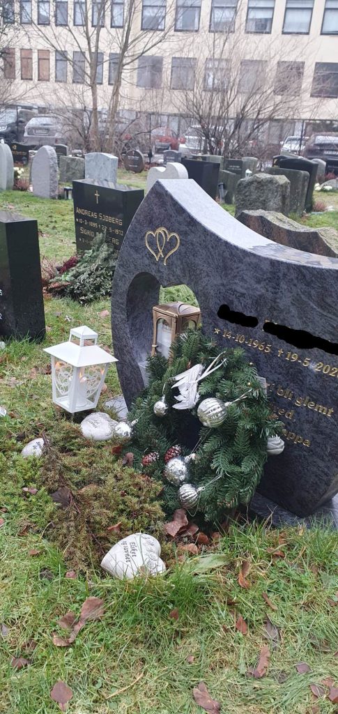 her er noen bilder fra kirkegården og gravsteinen hans. Navnet er suddet vekk da jeg ikke ønsker å dele det offentlig.